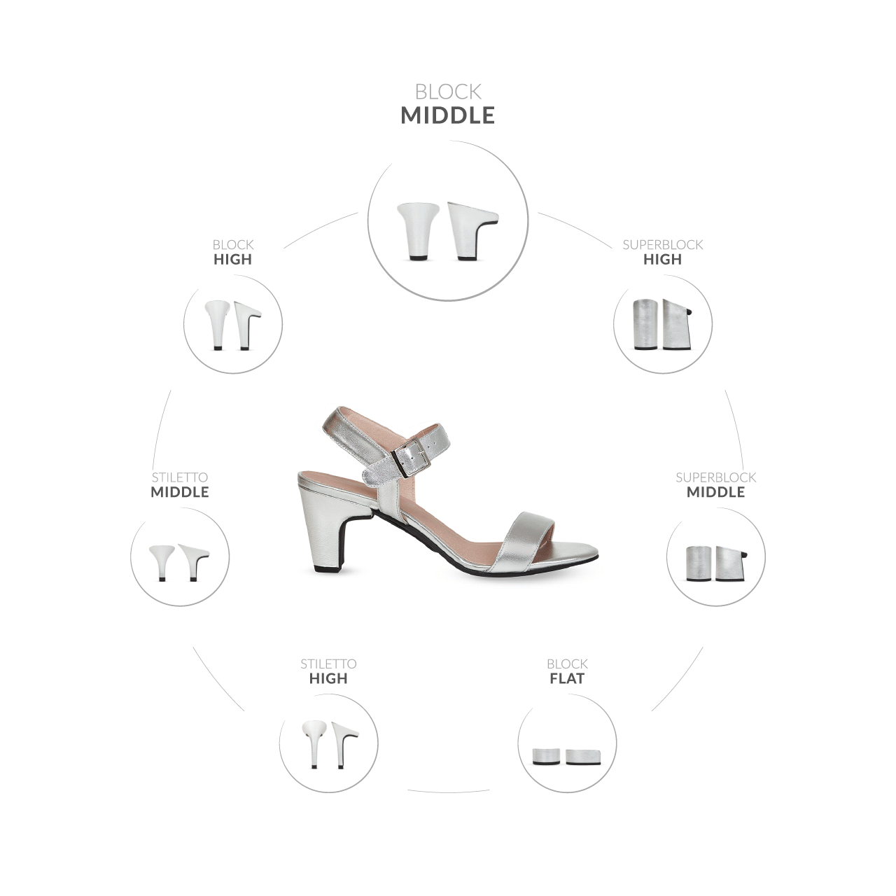 ASÍ FUNCIONA ¡Súper Fácil! 7 diferentes estilos de tacos. Diseños como Stiletto | Block | Superblock ¡Las alturas varían desde unos cómodos tacones de 3 cm a unos de 10 cm. El tamaño mediano con 7 cm es nuestro favorito, ya que para todas situaciones es el mejor tamaño. Los tacos se pueden cambiar directamente con el zapato puesto gracias al sistema CLIC, verás y sentirás lo rápido y fácil que es adaptar tu estilo. |
